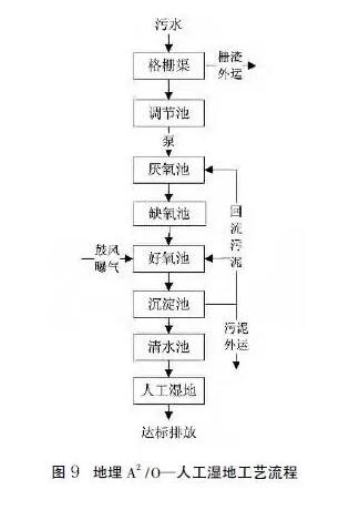 20、地埋A2/O-人工湿地技术:A2/O工艺亦称A-A-O工艺,本工艺为采用厌氧—缺氧—好氧法生物脱氮除磷工艺的简称,是流程最简单,应用最广泛的脱氮除磷工艺。适用于处理要求较高,四季气候变化大,气温较低的地区。处理规模不小于200吨/天。工艺参数:厌氧池停留时间不小于2h,缺氧池停留时间不小于4h,好氧池停留时间不小于6h,人工湿地水力负荷0.5~1.0m3/(m2˙d),污泥理周期180天,工艺流程见图9。