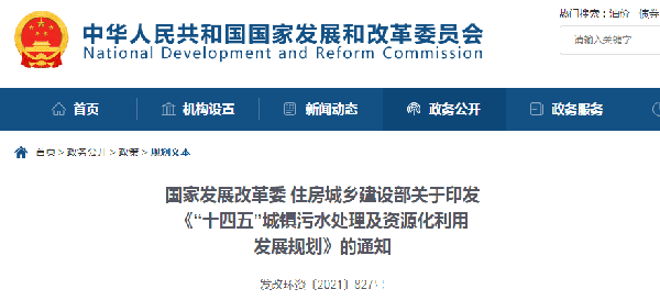 为深入贯彻习近平生态文明思想,加强生态环境保护,积极推进城镇污水处理领域补短板、强弱项工作,全面提升污水收集处理及资源化利用能力水平,国家发展改革委、住房城乡建设部商生态环境部研究编制了《“十四五”城镇污水处理及资源化利用发展规划》,现印发给你们,请认真贯彻执行。