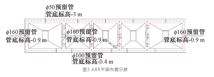 ABR反应池COD去除率设为85%,进出水COD分别为12 000mg/L、1 800mg/L,污泥浓度60g/L,有机负荷3.0 kgCOD/(m³·d),反应池升流速度0.32mm/s,ABR反应池为矩形钢筋混凝土半地上式,1座,结构尺寸L×W×H=17m×3m×7.5m,有效容积300m³,水力停留时间72h,格室数5格,第一进水和第五出水格室宽度4m,其余每格3m,每个格室下部安装污泥排放口便于取样观察厌氧污泥性能,上部储存空间相通,集体收集消化气;由于水量不大,为简便施工和节约建设成本,如图3、图4所示,每格室下部设置渐宽棱台,以3个直径160mm的PVC作为降流管,降流管下部沿棱台均匀布水,倾角60°,布水系统5套;ABR整体设置混合液回流,同时每格室设置内回流,可调控上升流速和水质。配套混合液回流泵、内回流泵各2台(2用2备),流量20m³/h,扬程10m,沼气水封及锅炉燃烧利用系统1套。