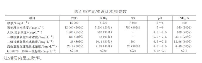 该厂工程案例设计时以平均水量100m³/d和最大污染负荷计算,根据构筑物功能及中试,整个污水处理流程各处理工段污染物设计去除配比见表2。
