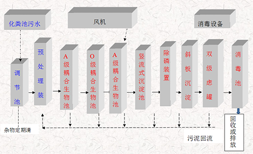 根据本项目污水的水质特点及我公司在类似污水处理工程中的实践经验,保证出水达到处理要求,确定工艺为:化粪池出水+调节池+一体化污水处理设备+双级虑罐+出水